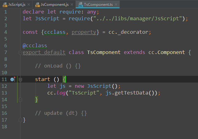 上午在论坛中找了各种方法,没有找到完美的ts require js方法,最好的就是declare let require: any声明require可以解决require报红错误问题,但是TsComponent在获取JsScript中的函数时候,编辑器没办法定义getTestData的类型。编辑的过程也没办法提示可调用方法,后续如果想ts和js混合使用,编辑过程就很麻烦,js脚本之间的require就没这个问题。