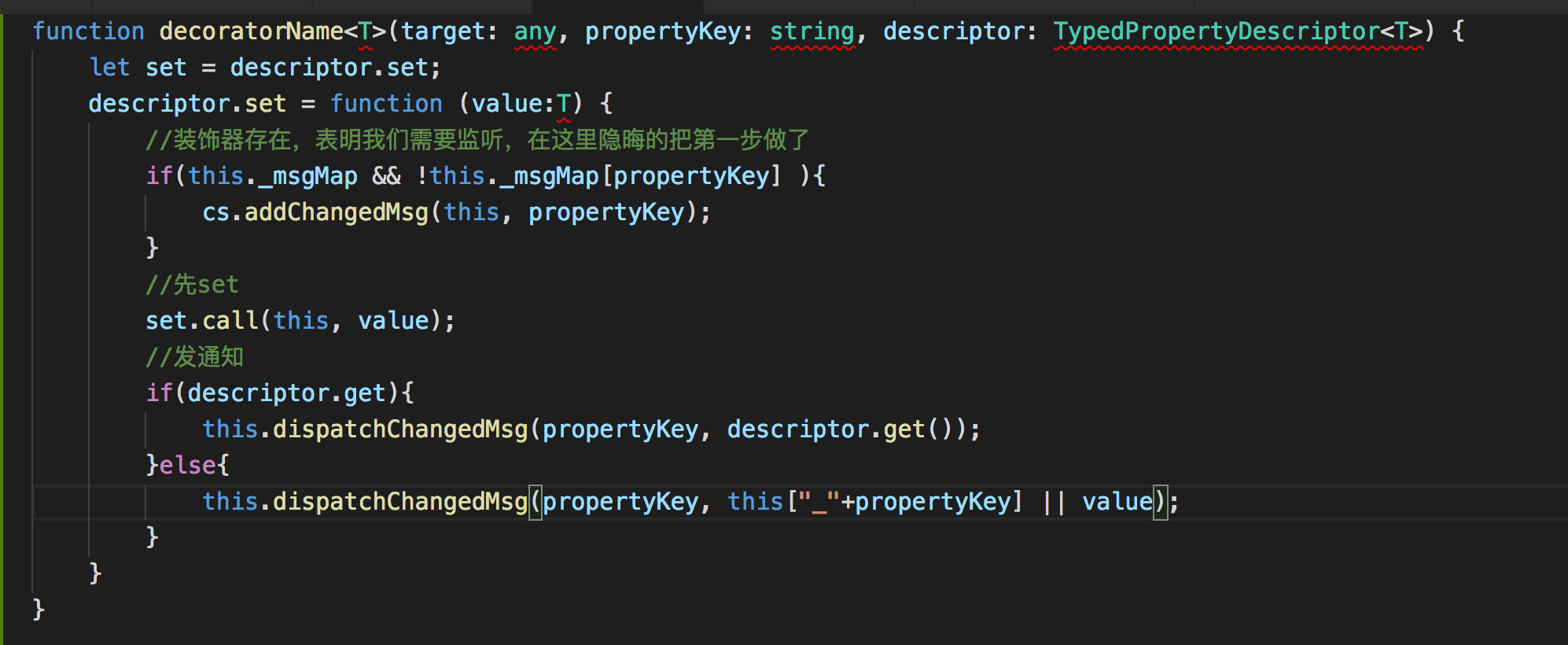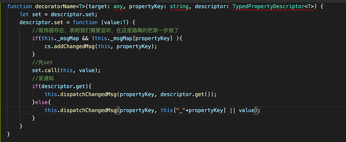 回到正题,这里怎么用装饰器来比较优雅地完成这些步骤呢,毕竟对每个需要监听的属性一个个去注册, set的时候发送消息其实挺恶心的,这时候装饰器做起来就比较舒服了