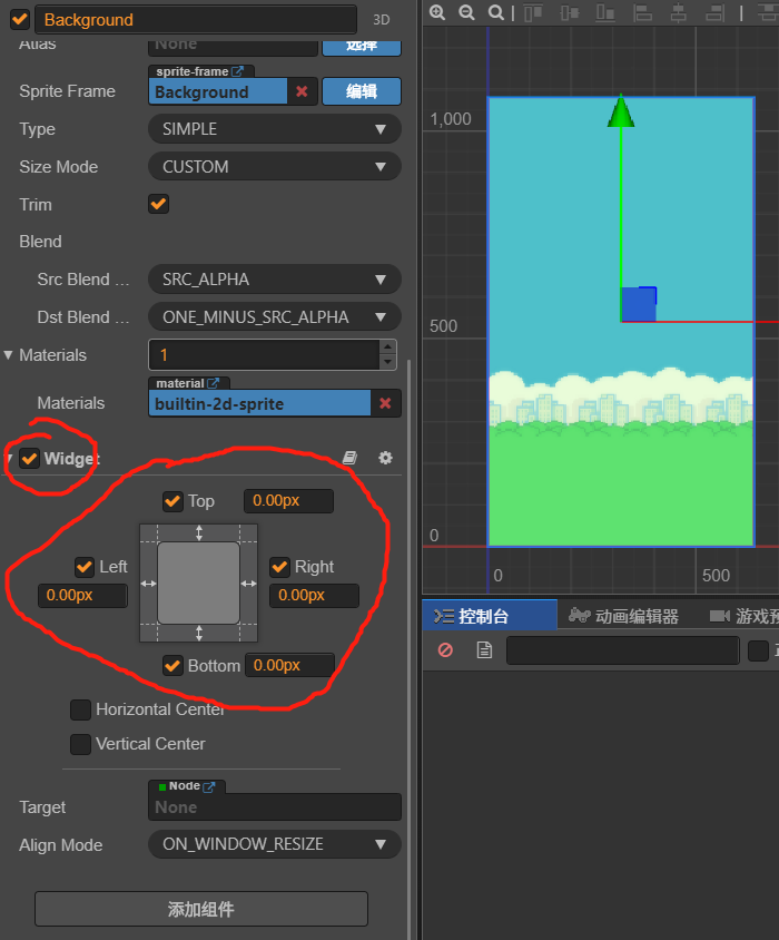 把背景图拖到场景中,把背景的大小设置成和canvas一样大,还需要添加widget组件来让背景填满整个屏幕
