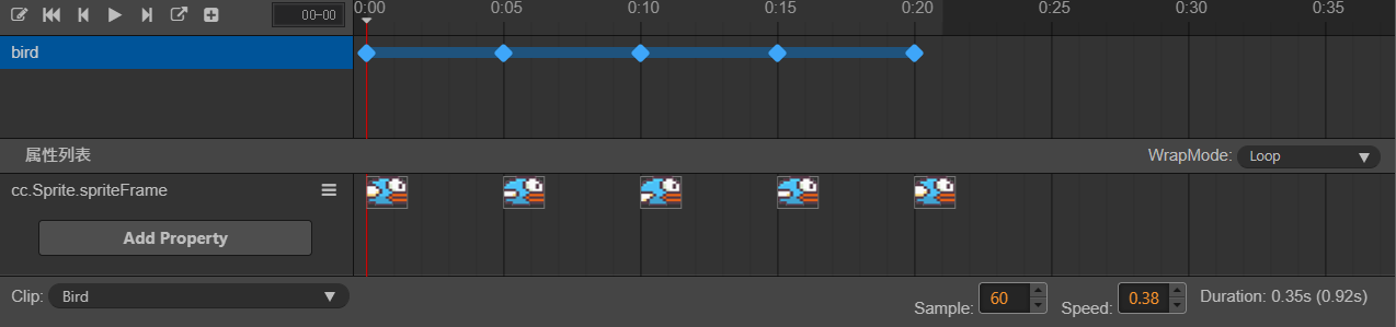 给小鸟添加动画组件,添加spriteFrame属性然后把图片一张一张拖进去,并按照图片设置好各种参数