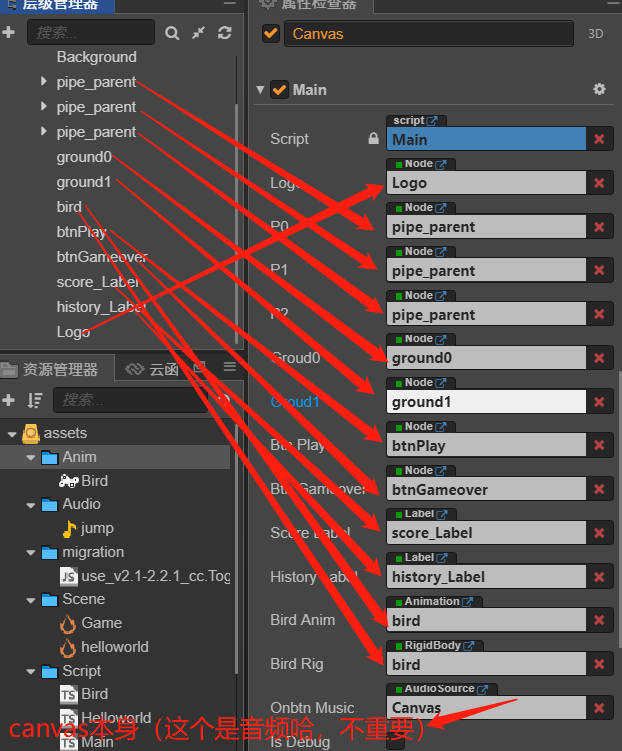 (分数节点取名为score_label,历史最高分取名为history_label,开始游戏按钮取名为btnPlay,重新开始按钮取名为btnGameover)