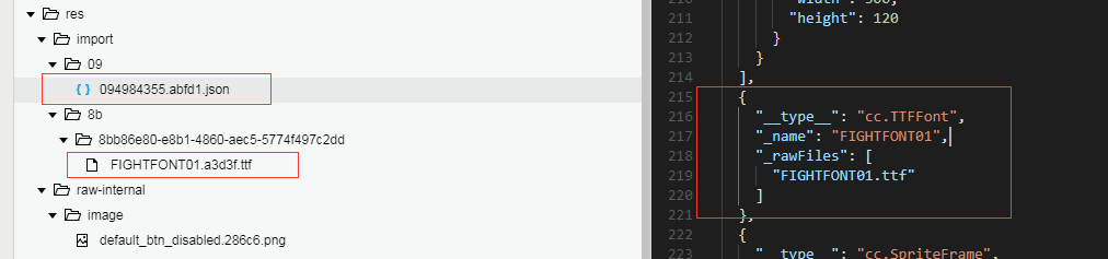 将json文件红框里的名字改成和资源里文件名字相同就可 这样ttf 在真机上好用 开发者工具里不行