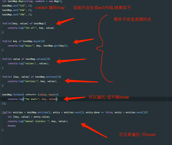 如题,我把tsconfig.json里的target改成es6或者es2015,自动生成的js代码还是es5的,而且使用for of遍历Map的代码明显不对,是取了Map的length来遍历。我之前用js开发的项目里遍历Map的代码可以被转成正确的es5代码。