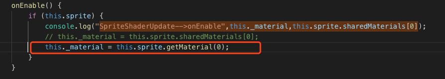 console.log(“SpriteShaderUpdate–>onEnable”,this._material,this.sprite.sharedMaterials[0]);
