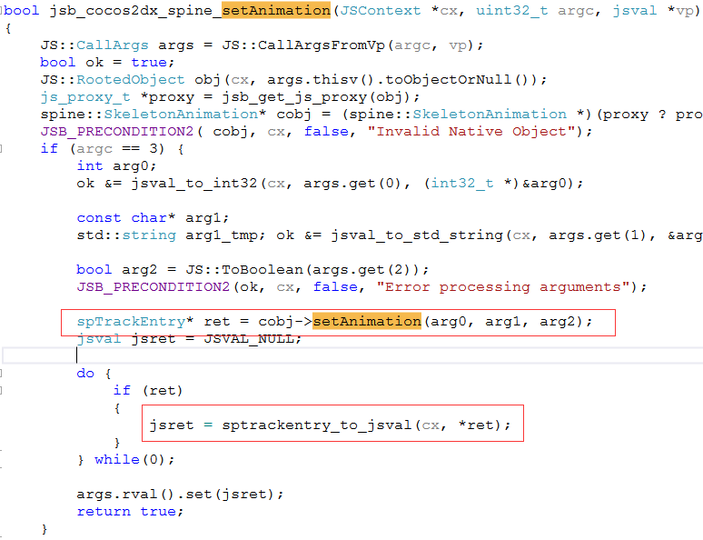 如图,setAnimation得到的TrackEntry在返回给js的时候调用了sptrackentry_to_jsval,后者的函数体中会根据地址作为key去map里面找过去的entry,找到就返回。