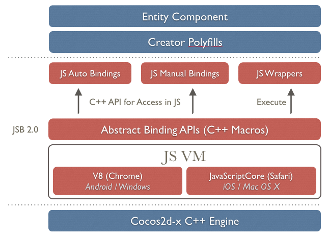 在 v1.6 以及之前版本中,Cocos Creator 一直使用 Spidermonkey 作为内置的 JS VM,并且一直直接使用 Spidermonkey 的 API 来实现绑定层代码。这点在 v1.7 中发生了重大的改变,我们将内置的 JS VM 切换为 V8 以及 JavaScriptCore(JSC),根据发布平台自动切换,并且抽象统一了绑定层的 API,让不同的 JS VM 可以无缝切换。
