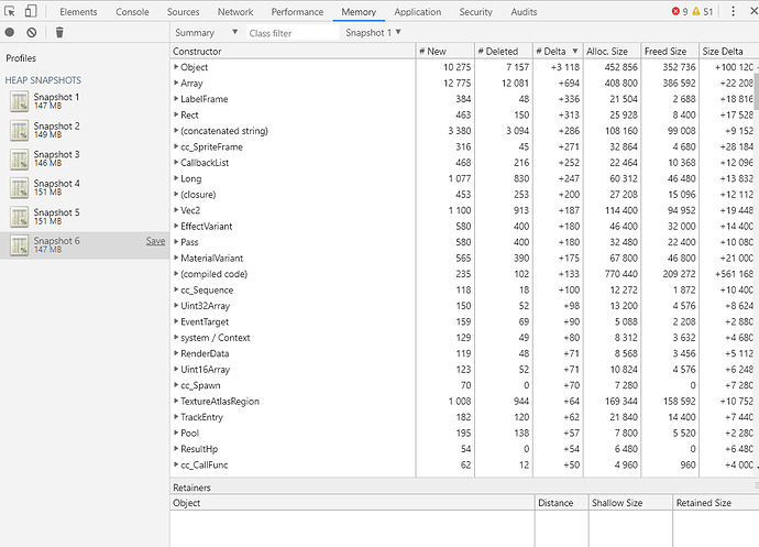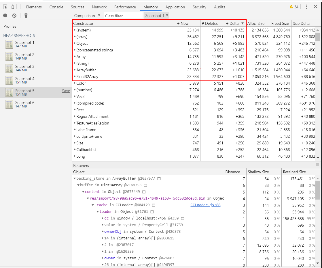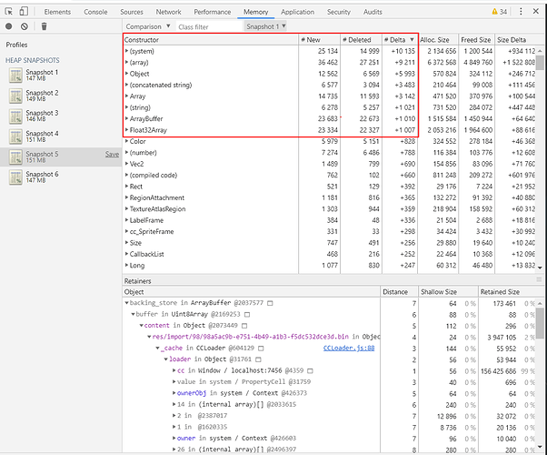 相同的战斗,每一场都一样,加载的资源也一样。但对象数不会断堆加,特别是ArrayBuff、Float32Array、Array等,查看内容都是和cc.loader加载有关。