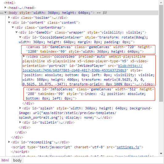1.看看html结构图,如果你看过cocos默认的,你就会发现差别…是的,我自己添加了一个canvas.测试发现,自己增加的canvas是以canvas模式渲染,并不像cocos自带的以webgl形式.