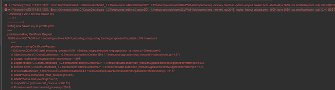 [Window] 生成证书失败!错误:Error: Command failed: C:\CocosDashboard_1.0.6\resources.editors\Creator3D\1.1.1\resources\tools\openSSLWin64\bin\openssl req -newkey rsa:2048 -nodes -keyout private.pem -x509 -days 3650 -out certificate.pem -subj /C=中国/ST=江苏省/L=nanjing/O=nanjingdaoyuan/OU=daoyuan/CN=zengzhikun/emailAddress=zenskcode@yeah.netGenerating a 2048 bit RSA private key…+++…+++writing new private key to ‘private.pem’-----problems making Certificate Request18292:error:0D07A097:asn1 encoding routines:ASN1_mbstring_ncopy:string too long:crypto\asn1\a_mbstr.c:109:maxsize=2