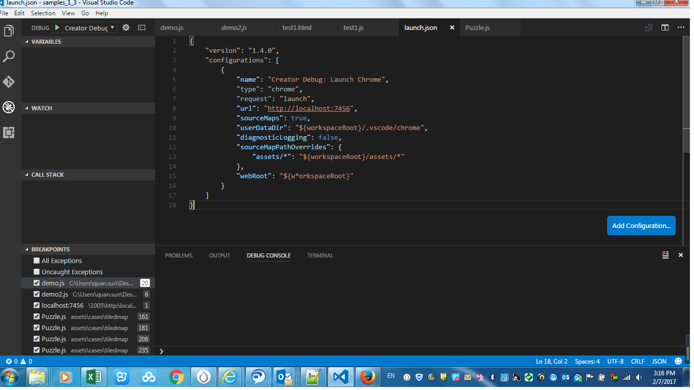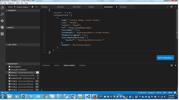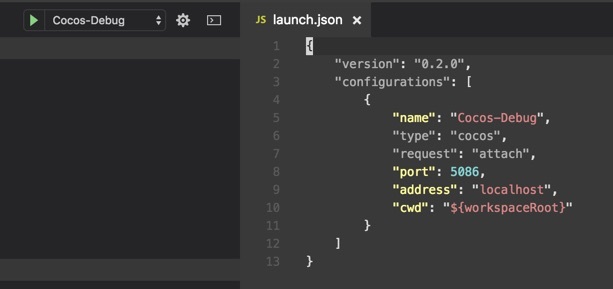 安装插件成功后,在 VS Code 左侧 tab 中选择第四个 Debug,然后可以点击上面的齿轮选择 Cocos-JSB 调试方案。