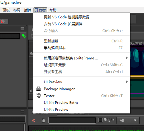 2、 Cocos Creator 里面的 VS Code 工作流在上方菜单栏的[开发者]里面:
