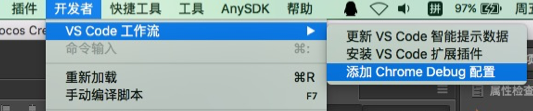 **接下来在 Cocos Creator 编辑器主菜单里执行 VS Code 工作流->添加 Chrome Debug 配置,**这个菜单命令会在你的项目文件夹下添加一个 .vscode/launch.json 文件作为调试器的配置,之后你就可以在 VS Code 里点击左侧栏的 调试 按钮打开调试面板,并在最上方的调试配置中选择 Creator Debug: Launch Chrome,然后点击绿色的开始按钮开始调试。