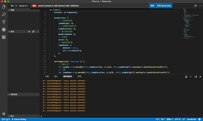 使用vscode进行调试一直报错,显示cannot connect to JSB