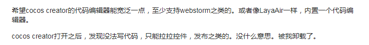 希望cocos creator的代码编辑器能宽泛一点,至少支持webstorm之类的。或者像LayaAir一样,内置一个代码编辑器。