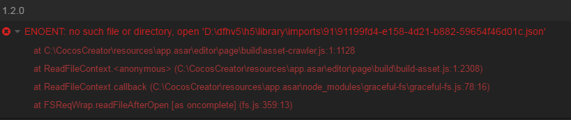 遇到类似问题 但是不影响游戏,看着闹心。先后经历了 1.1.2 和1.2 ,中途删除和添加过部分资源无数次,是否有可能前一版本记录了某些文件的引用,新版本没有了则提示no such file,并且这些缺少的文件不影响实际内容。