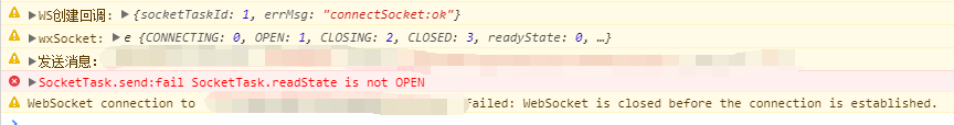 ws地址使用的是内网测试地址,但是在开发者工具中勾选了不校验合法域名,使用HTTP是正常的,在使用ws的时候创建ws对象回调后发送链接抛出 SocketTask.readState is not OPEN