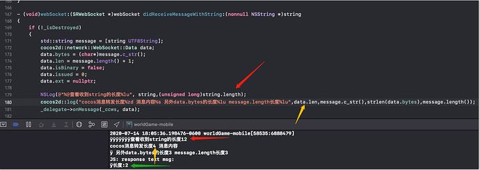 2个红色箭头是系统收到websocket的消息长度,但是转换到cocos2d后,发现消息长度和消息内容都变短了(2个黄色箭头),最后的绿色箭头是js里面收到的消息和长度,小弟无才,不知道如何解决,请求大大们能都帮帮忙,谢谢