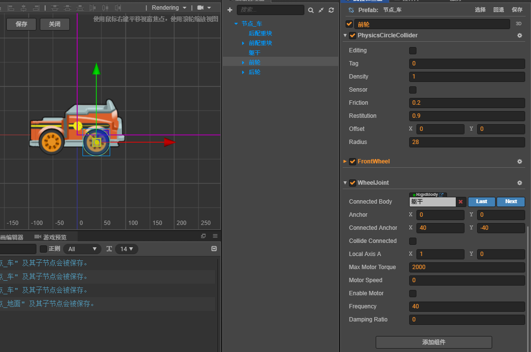 小车的轮胎单独移动时,弹力效果正常, 绑定了轮子组件后,弹力效果差了很多甚至消失,请问应该如何处理?