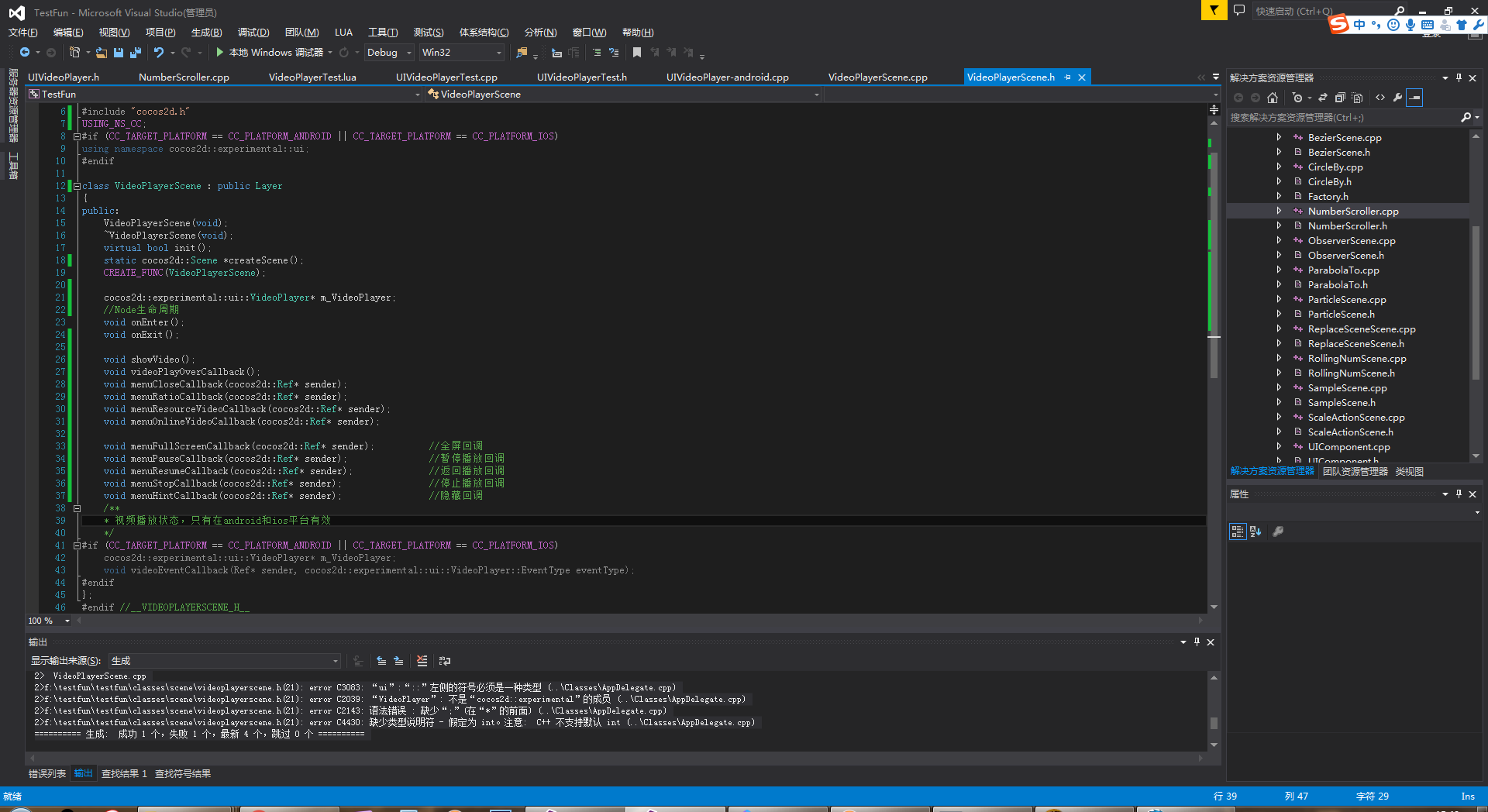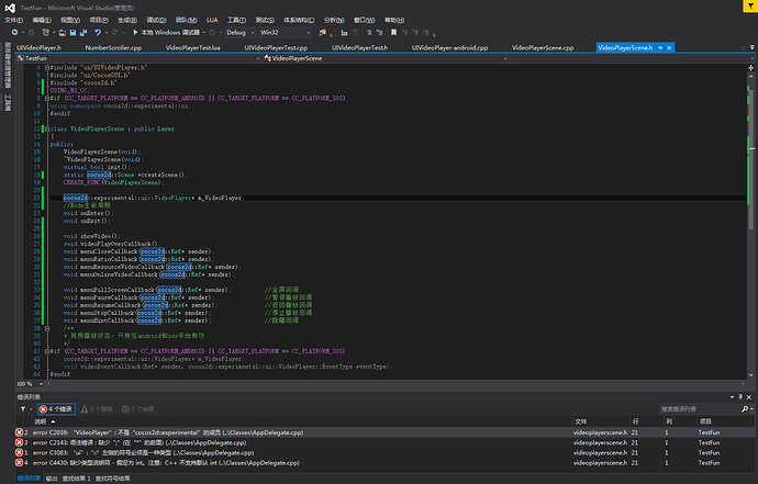2>f:\testfun\testfun\classes\scene\videoplayerscene.h(21): error C2143: 语法错误 : 缺少“;”(在“*”的前面) (…\Classes\AppDelegate.cpp)
