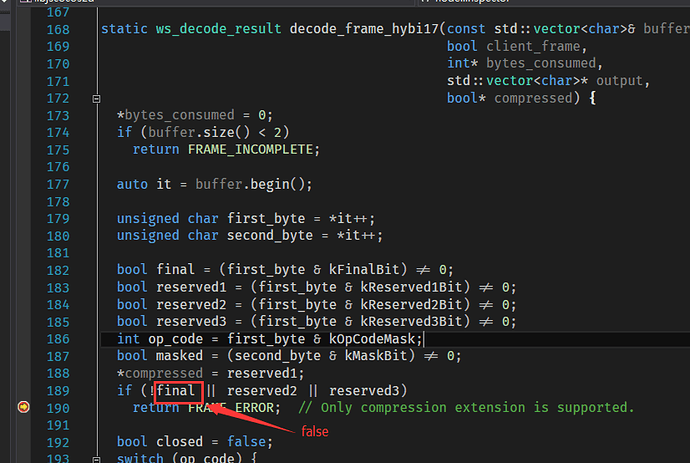 但是decode_frame_hybi17函数遇到FIN为0时,直接返回了FRAME_ERROR: