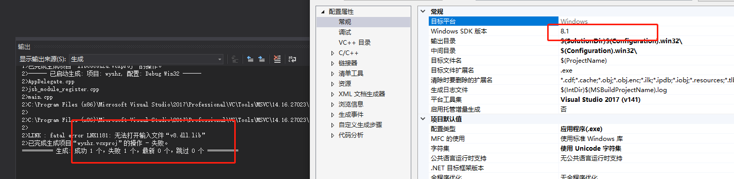 2>LINK : fatal error LNK1181: 无法打开输入文件“v8.dll.lib”