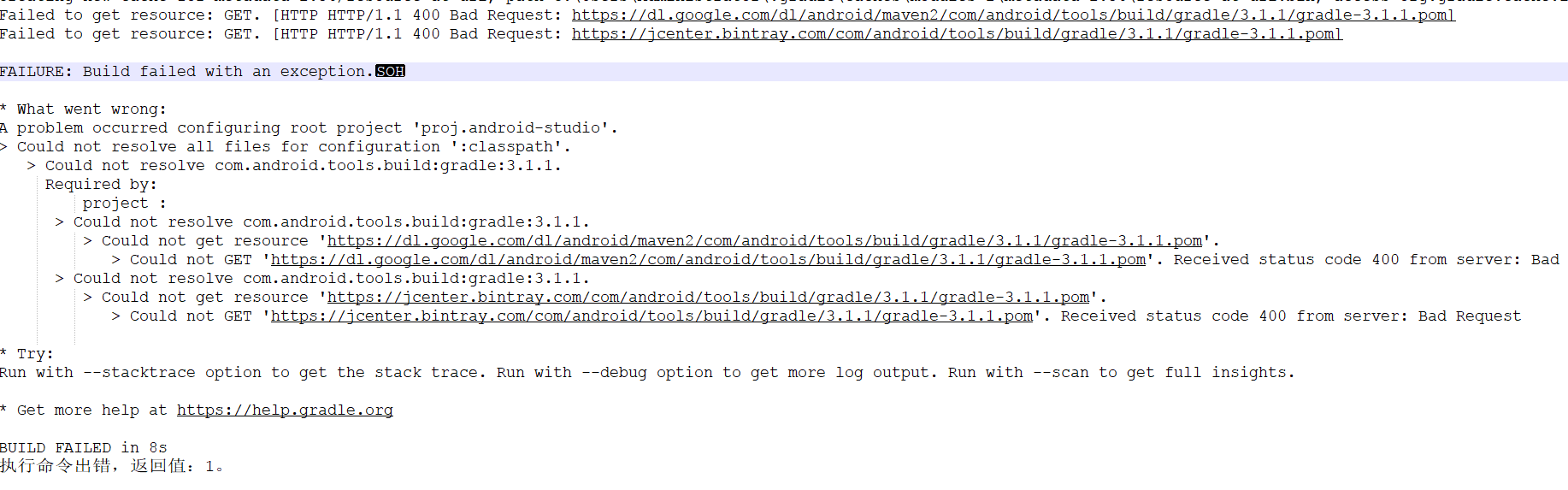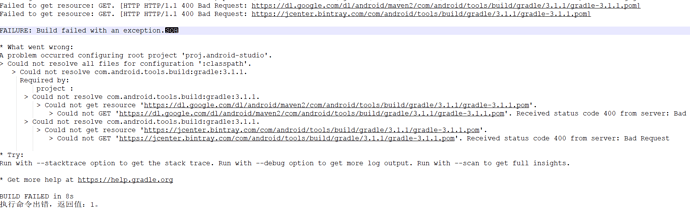 Failed to get resource: GET. [HTTP HTTP/1.1 400 Bad Request: https://jcenter.bintray.com/com/android/tools/build/gradle/3.1.1/gradle-3.1.1.pom]