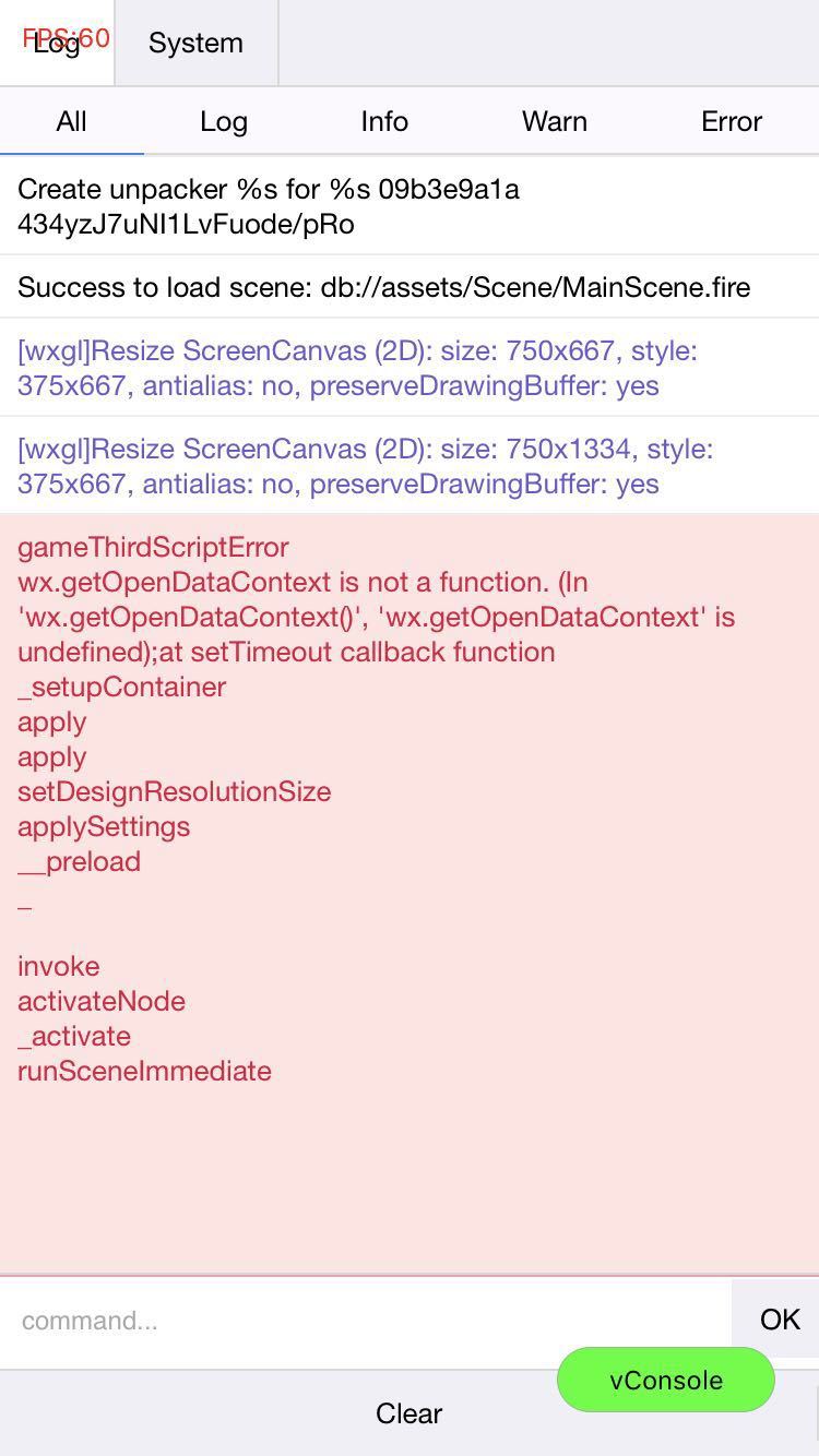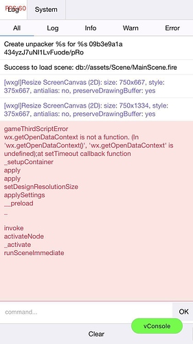 因为微信版本太低了,没有这个方法,需要修改引擎源代码做修复,搜索wx.getOpenDataContext只有一处使用,大概是core/platform/CCView.js的1097行