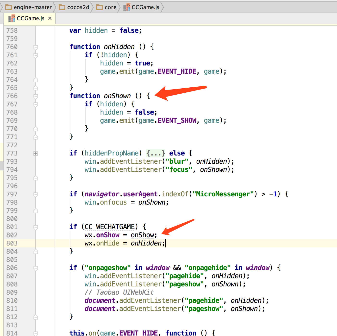 这不是我的代码,是官方引擎的代码,就是因为他们拼写错了,才导致那个从后台切到前台的事件发不出去,我监听那个事件无效,最后还是直接调用的微信的。