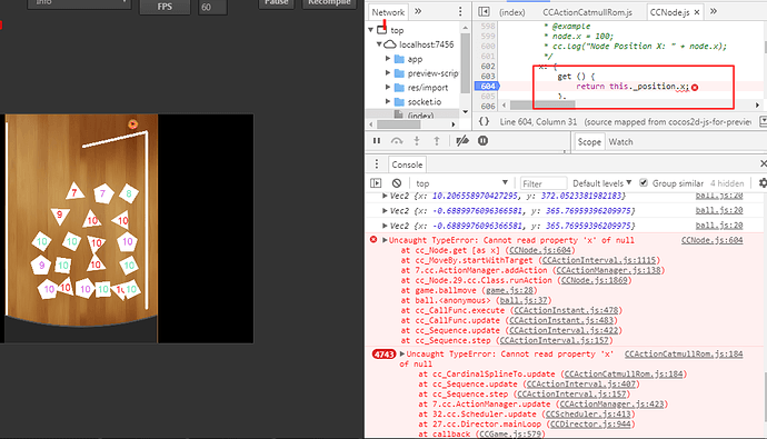 小球碰到地面然后返回到如图中小球的位置并生成新的障碍物(原来的障碍物上移),生成到6排的时候就提示X为空属性,这是为什么呢
