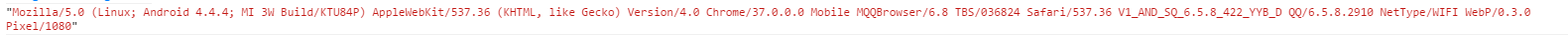 “Mozilla/5.0 (Linux; Android 4.4.4; MI 3W Build/KTU84P) AppleWebKit/537.36 (KHTML, like Gecko) Version/4.0 Chrome/37.0.0.0 Mobile MQQBrowser/6.8 TBS/036824 Safari/537.36 V1_AND_SQ_6.5.8_422_YYB_D QQ/6.5.8.2910 NetType/WIFI WebP/0.3.0 Pixel/1080”