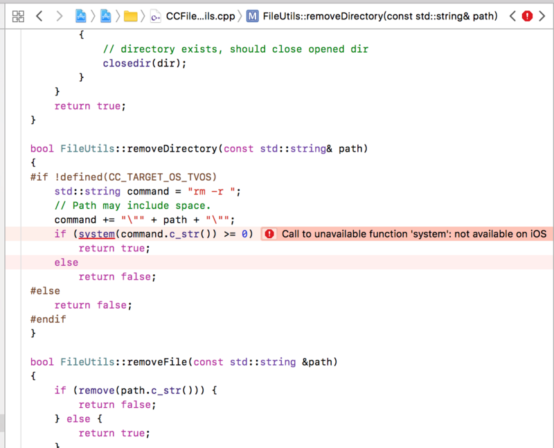 最新版本xcode(9.0)编译cocos creator 1.6.1创建出的native工程出错,提示system方法已被移除