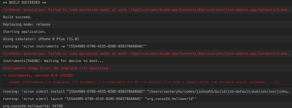 running: ‘xcrun simctl launch “155A4905-D786-4535-B20E-B50370A60A8C” “org.cocos2d.helloworld”’