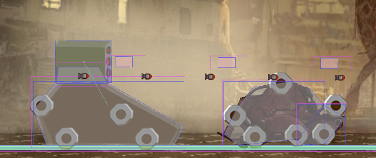 这张图是没有使用Camera的,从一辆车发射子弹,子弹节点是添加了刚体组件与Collider组件,可以看出碰撞体与